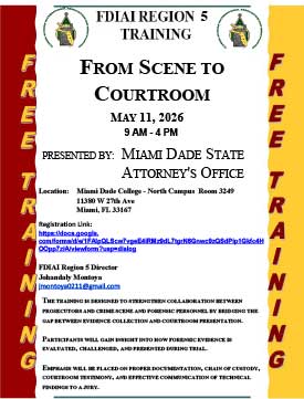 The Florida Division of the International Association for Identification is a non-profit professional association for forensic scientists, crime scene technicians, evidence technicians, latent print examiners and all other law enforcement employees who are interested in the scientific investigation of crime. The FDIAI is the largest state chartered division of the International Association for Identification and hosts one of the largest annual educational training conferences available in the country.