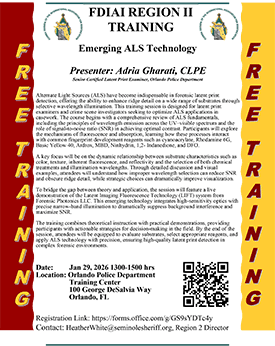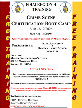 The Florida Division of the International Association for Identification is a non-profit professional association for forensic scientists, crime scene technicians, evidence technicians, latent print examiners and all other law enforcement employees who are interested in the scientific investigation of crime. The FDIAI is the largest state chartered division of the International Association for Identification and hosts one of the largest annual educational training conferences available in the country.