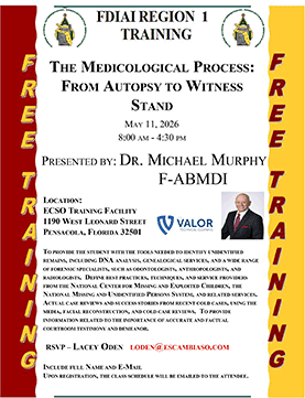The Florida Division of the International Association for Identification is a non-profit professional association for forensic scientists, crime scene technicians, evidence technicians, latent print examiners and all other law enforcement employees who are interested in the scientific investigation of crime. The FDIAI is the largest state chartered division of the International Association for Identification and hosts one of the largest annual educational training conferences available in the country.